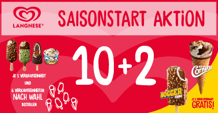 Beim Kauf von 10 Verkaufseinheiten erhältst du 2 weitere Verkaufseinheiten kostenlos dazu.Ideal für einen starken Start in die Eis-Saison mit bewährten Klassikern und starken Impulsartikeln von Langnese.